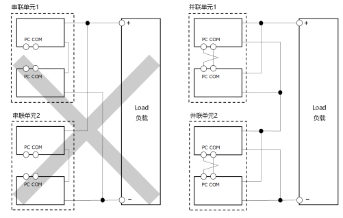 相比之下,將已經(jīng)并聯(lián)連接的TDK-Lambda電源單元進(jìn)行串聯(lián)是可行的。因?yàn)椴⒙?lián)連接的電源單元電壓相同,將它們串聯(lián)起來不會(huì)引發(fā)上述問題。但即便如此,也需要注意以下幾點(diǎn):